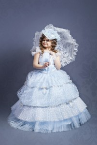 Пышное платье с немно голубым цветом, украшено бантами и лентой по всей юбке