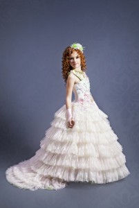 Кремовое платье с многослойной пышной юбкой, ззади - шлейф. Корсет украшен апликацией и камнями с переходом на юбку.