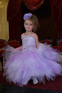 Двухцветное платье - белое с сиреневым, украшено по корсете большим цветком из камней, что розходится по всему корсету.