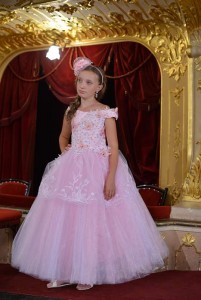 Розовое платье, густо украшено апликацией камнями и бабочками.