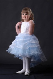 Белый корсет и голубая юбка, переходящяя сзади опущеный низ, украшенно платье аппликацией.