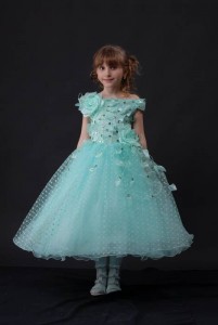 Бирюзовое в белый горох платье с большими цветами и камнями.