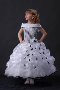 Белый в густой горох корсет, кристалиновая пышная юбка, украшена цветком и камнями.